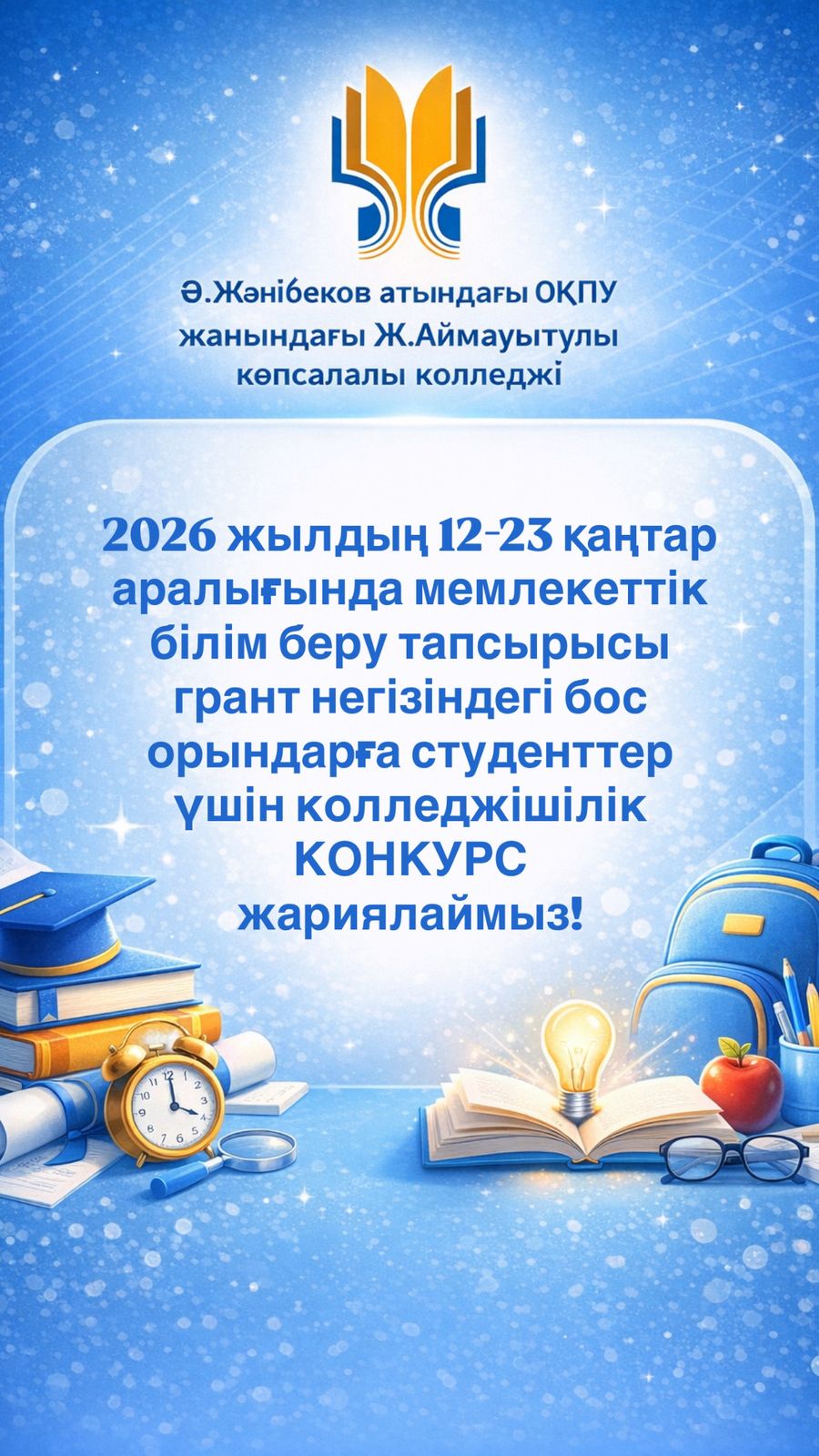 2026 жылдың 12-23 қаңтар аралығында мемлекеттік білім беру тапсырысы грант негізіндегі бос орындарға студенттер үшін колледжішілік