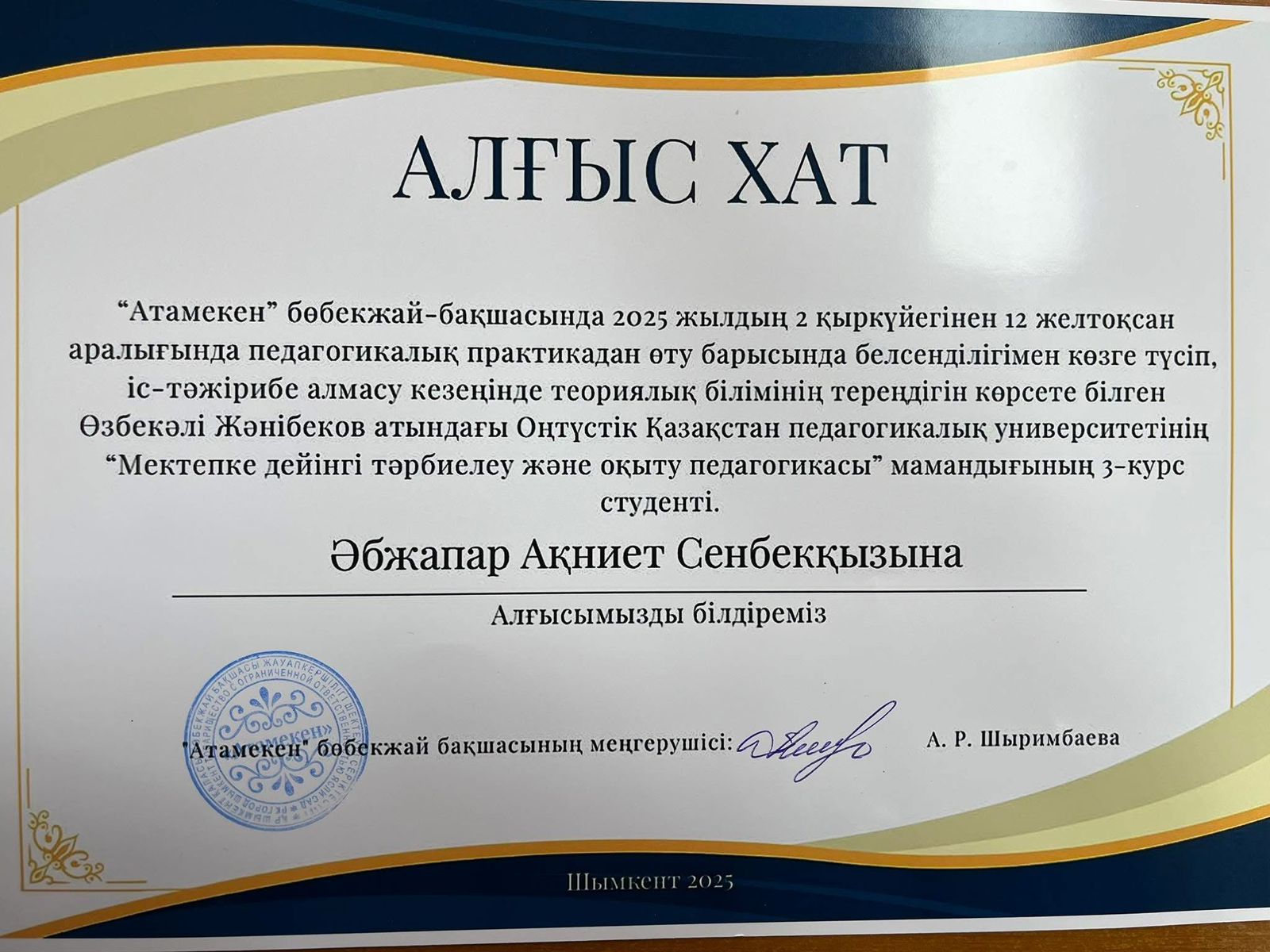 Алғыс хат. Сыдыкова Р.Ш.