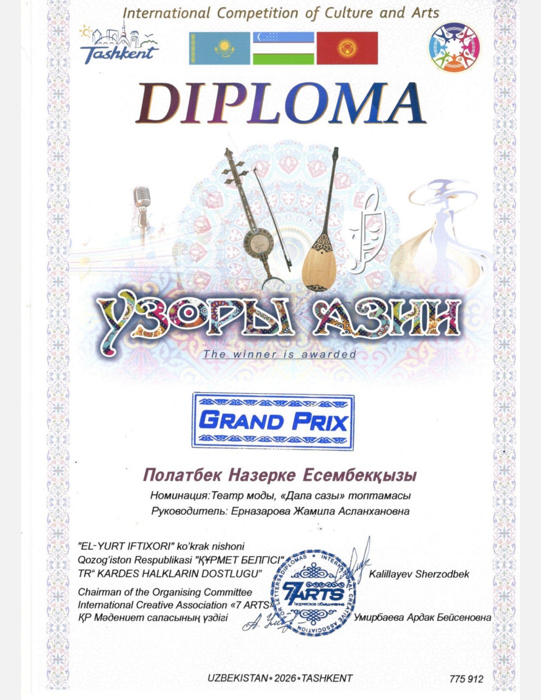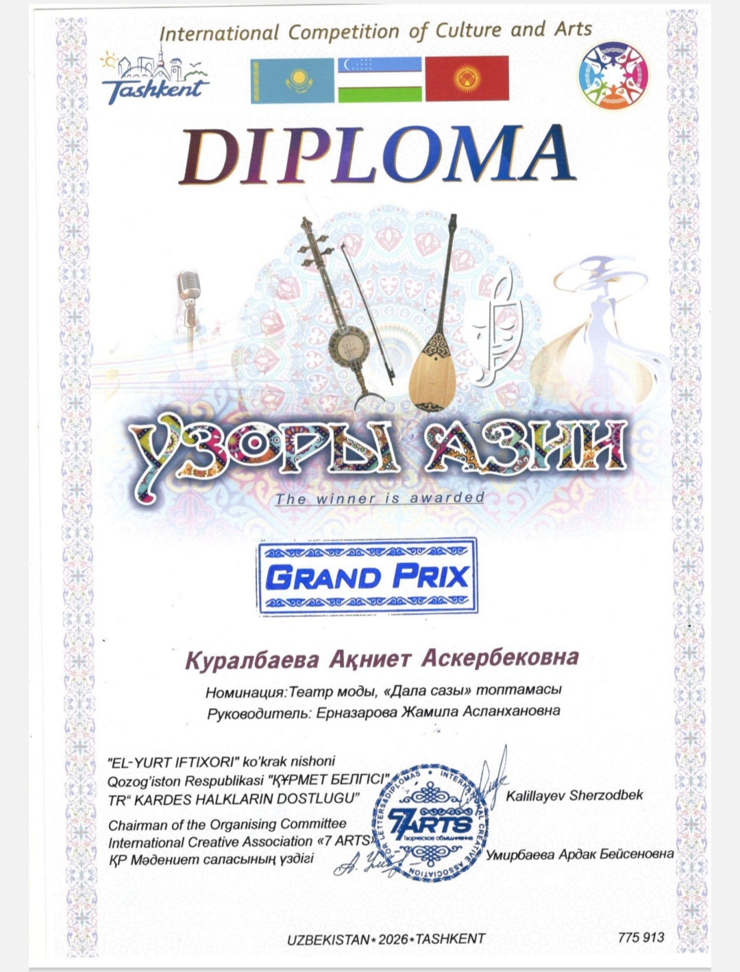 Өзбекстан Республикасы Ташкент қаласында «Узоры Азии» аты мәдениет және өнер халқаралық фестиваль-байқауы Бас жүлде.