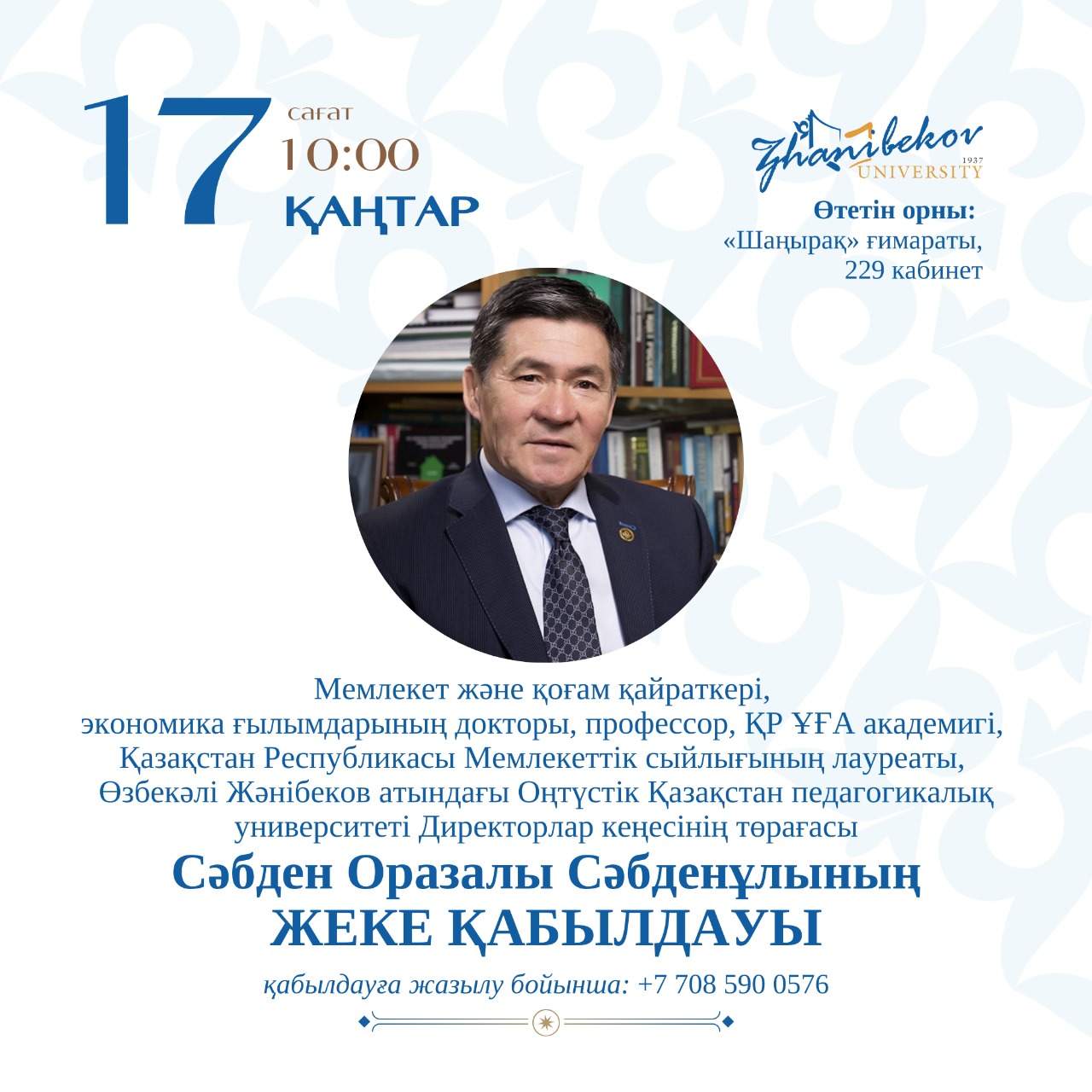 Экономика ғылымдарының докторы, академик, Өзбекәлі Жәнібеков атындағы ОҚПУ директорлар кеңесінің төрағасы Оразалы Сәбден университеттің профессор-оқытушылар құрамына қабылдау өткізеді.