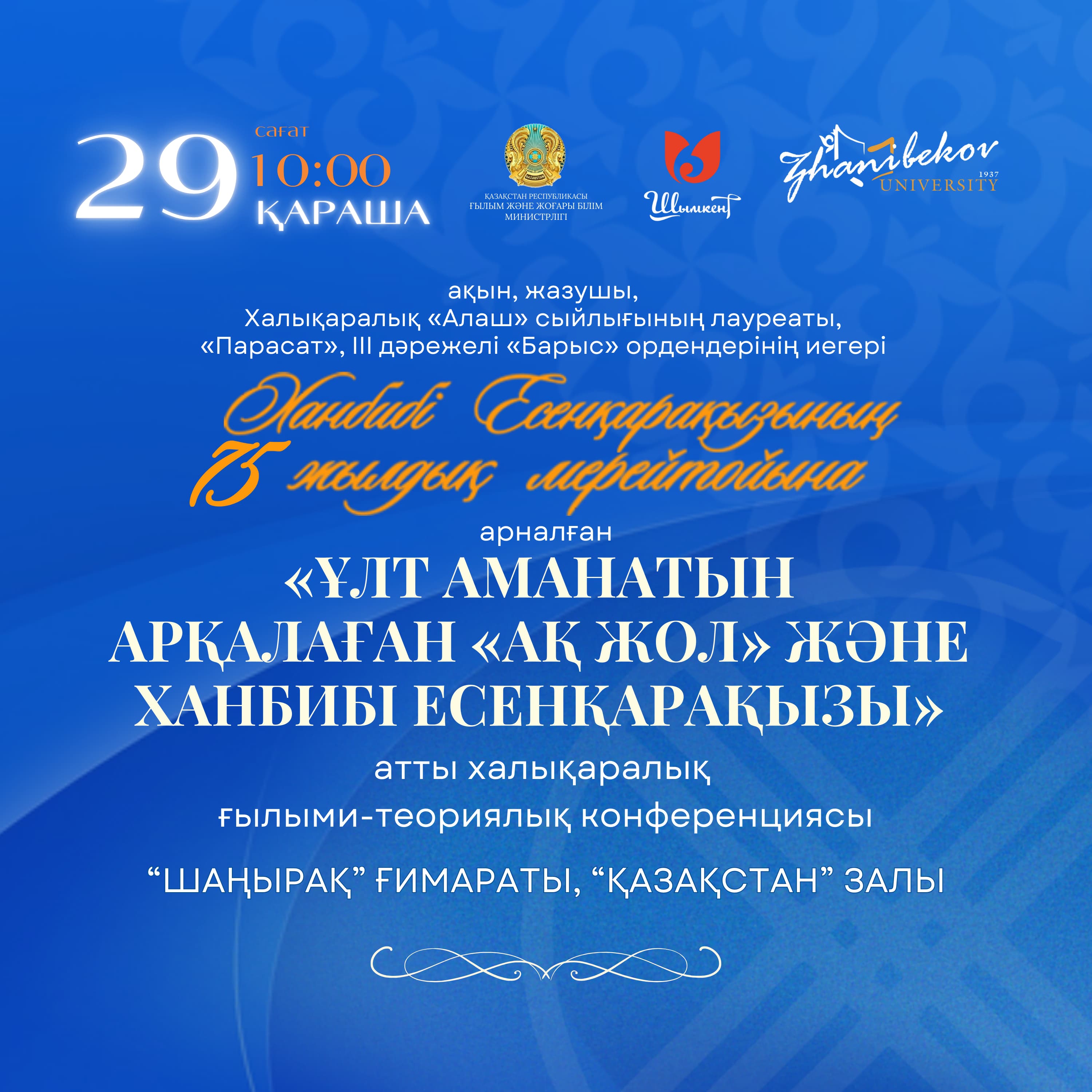 «ҰЛТ АМАНАТЫН АРҚАЛАҒАН «АҚ ЖОЛ» ЖӘНЕ ХАНБИБІ ЕСЕНҚАРАҚЫЗЫ» атты халықаралық ғылыми-теориялық конференциясына шақырамыз!