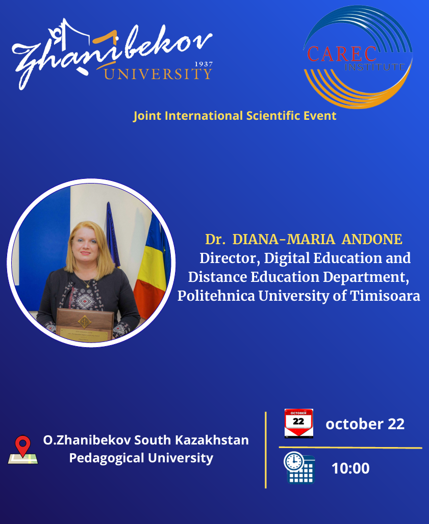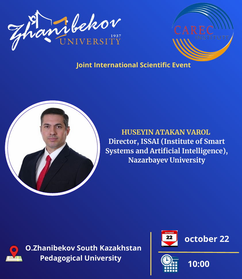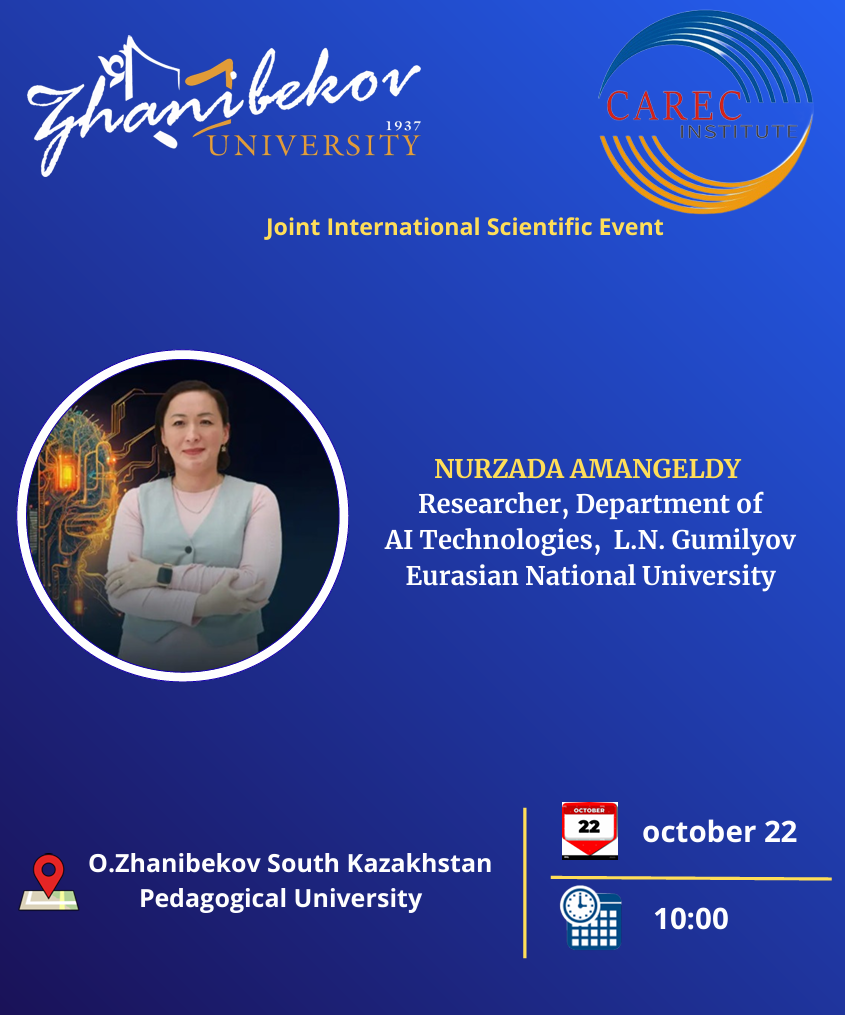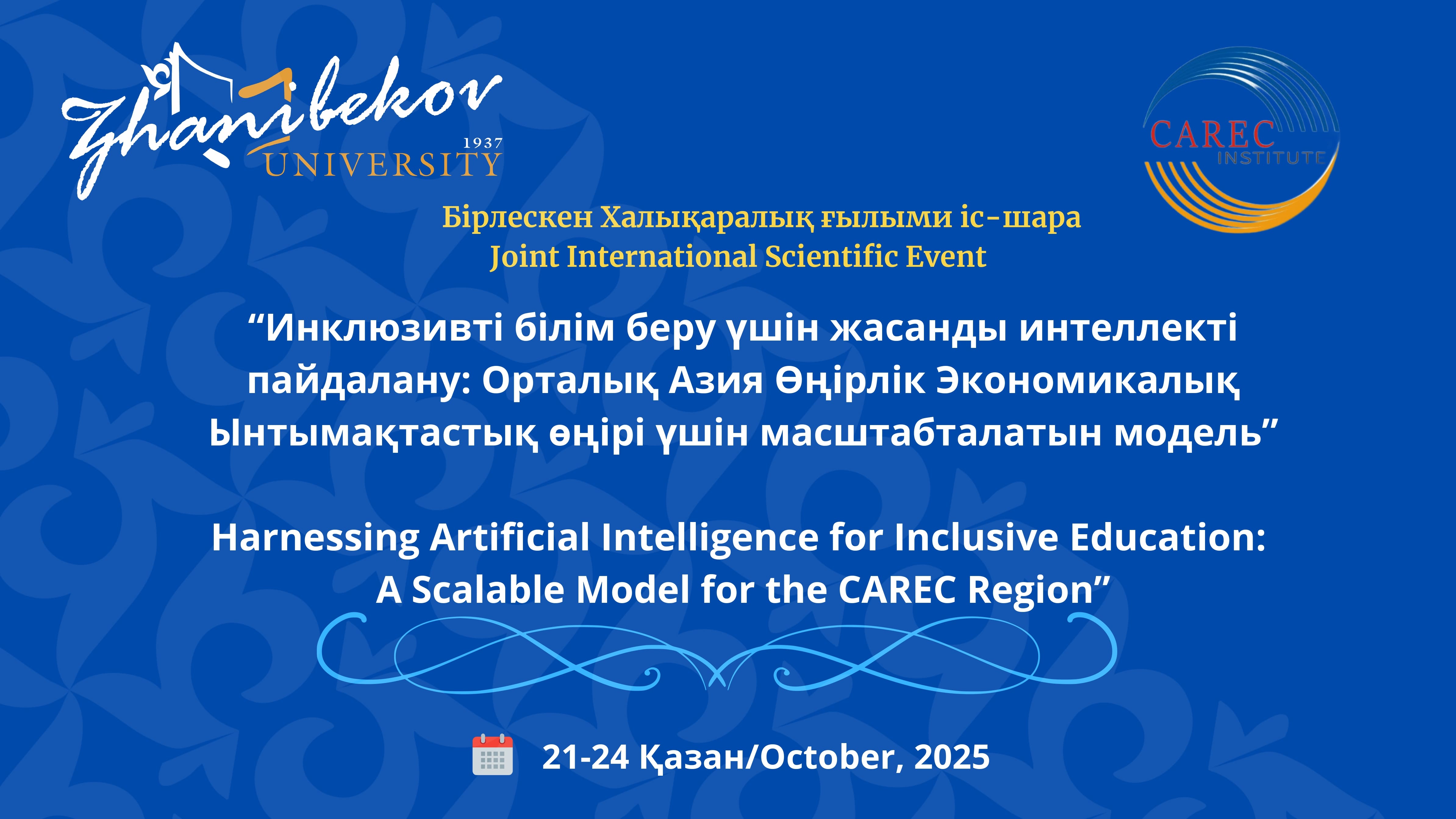 Өзбекәлі Жәнібеков атындағы Оңтүстік Қазақстан педагогикалық университетінде 2025 жылғы 21–24 қазан аралығында «Инклюзивті білім беру үшін жасанды интеллектіні пайдалану: Орталық Азия өңірлік экономикалық ынтымақтастығы (CAREC) өңірі үшін масштабталатын модель» атты халықаралық іс-шарасы өткізіледі.