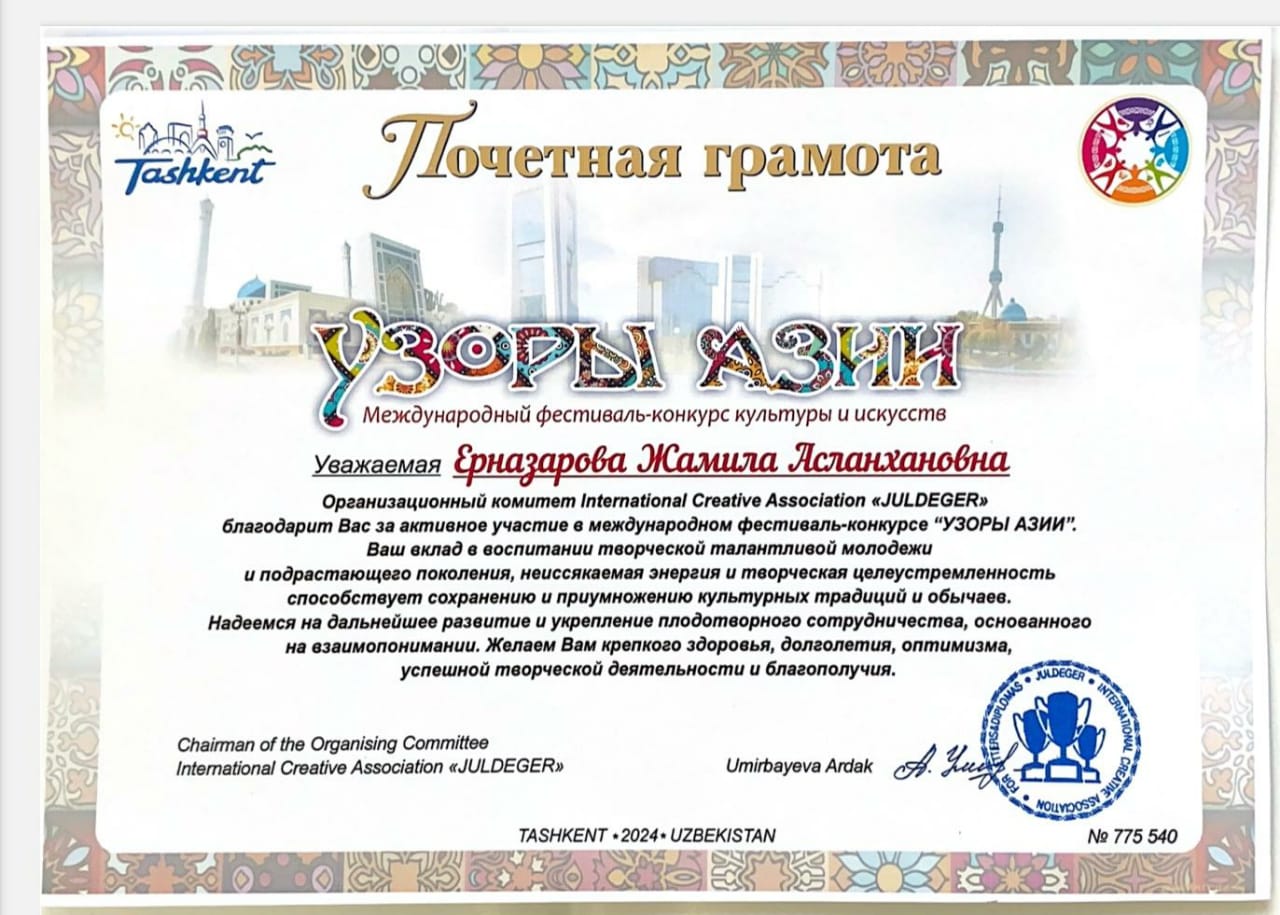 Өзбекстан Республикасы Ташкент қаласында «Узоры Азии» аты мәдениет және өнер халқаралық фестиваль-байқауы Бас жүлде.