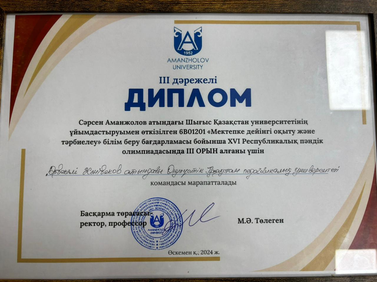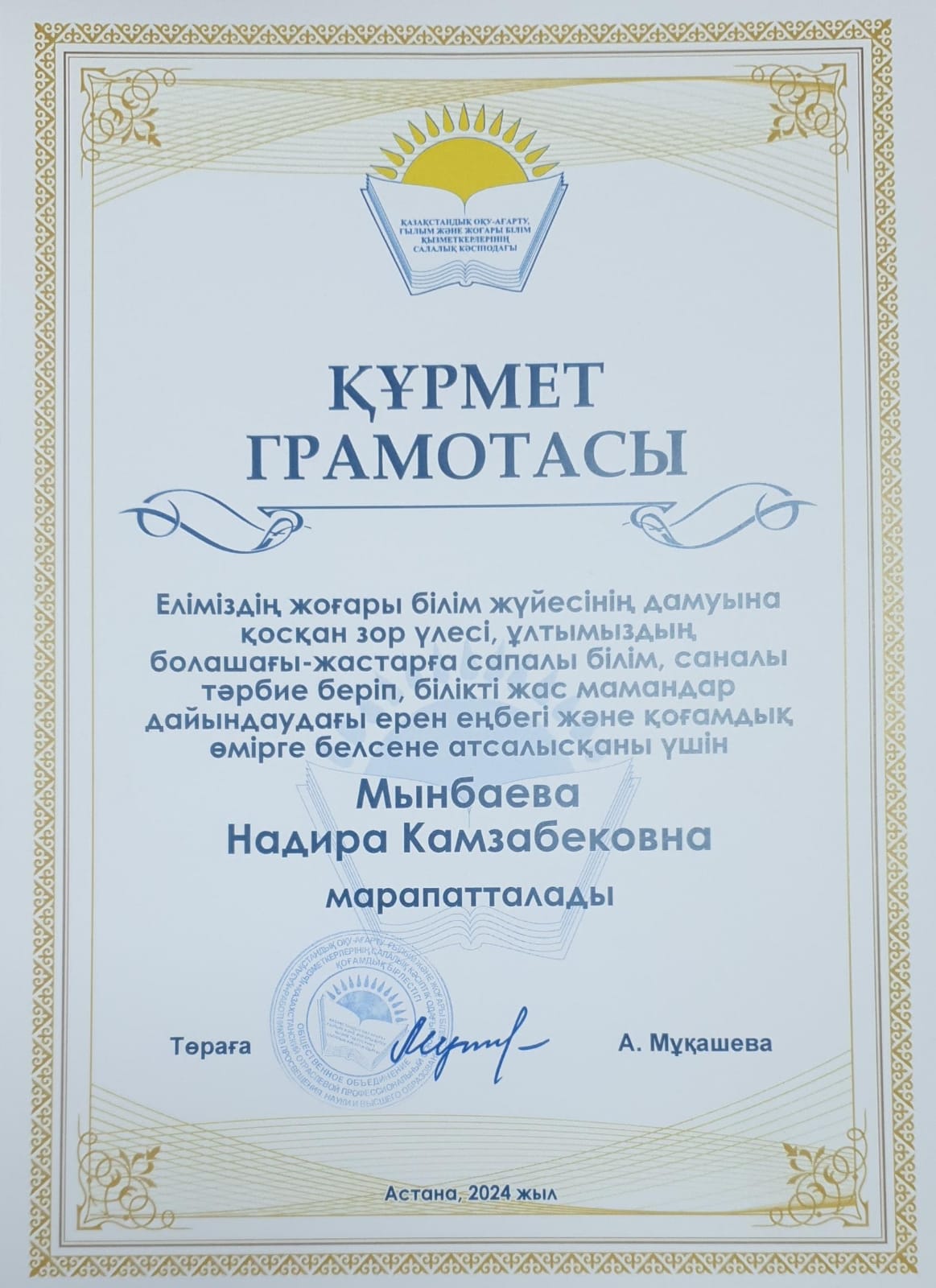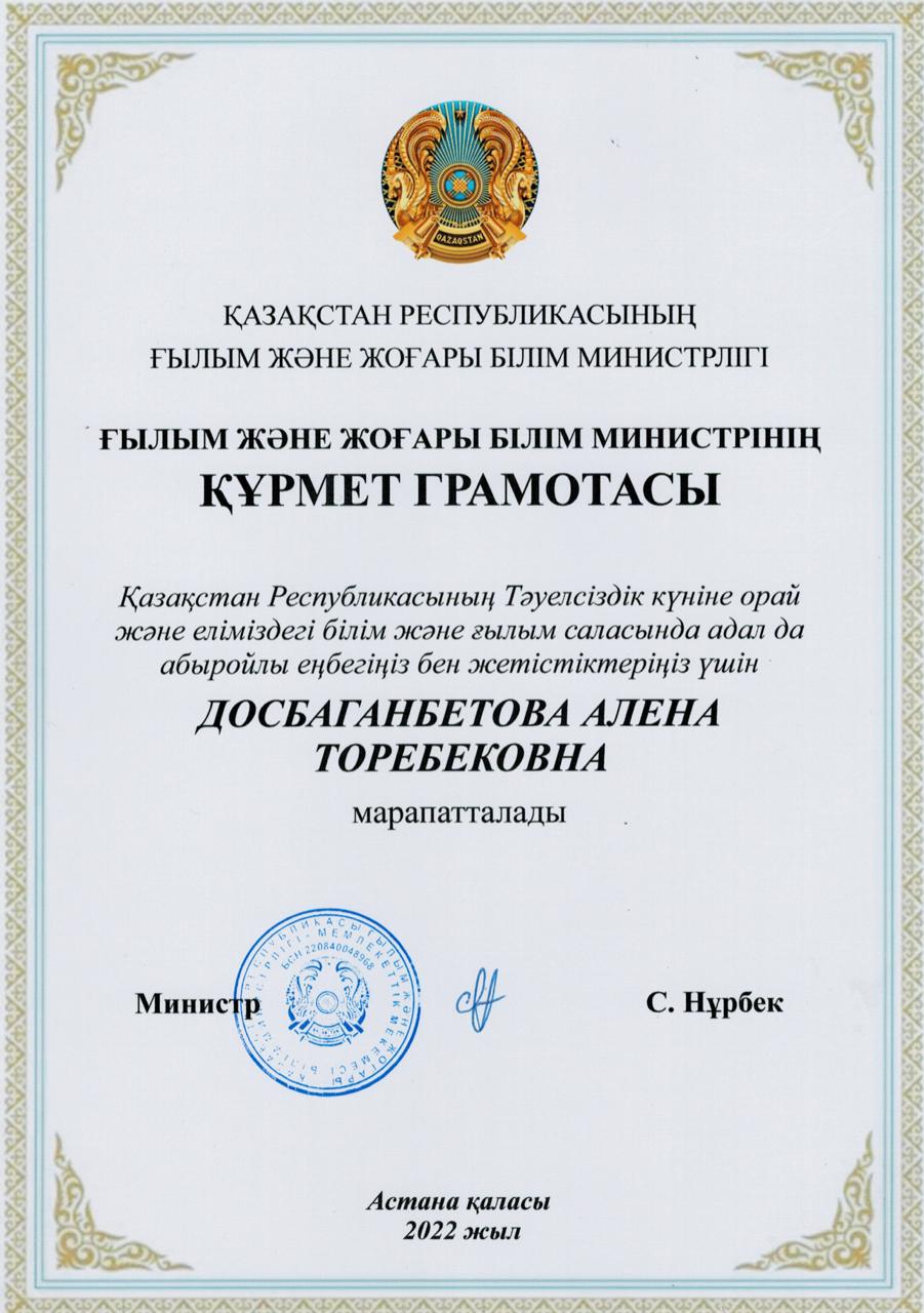 Құрмет грамотасы. Досбаганбетова А.Т.