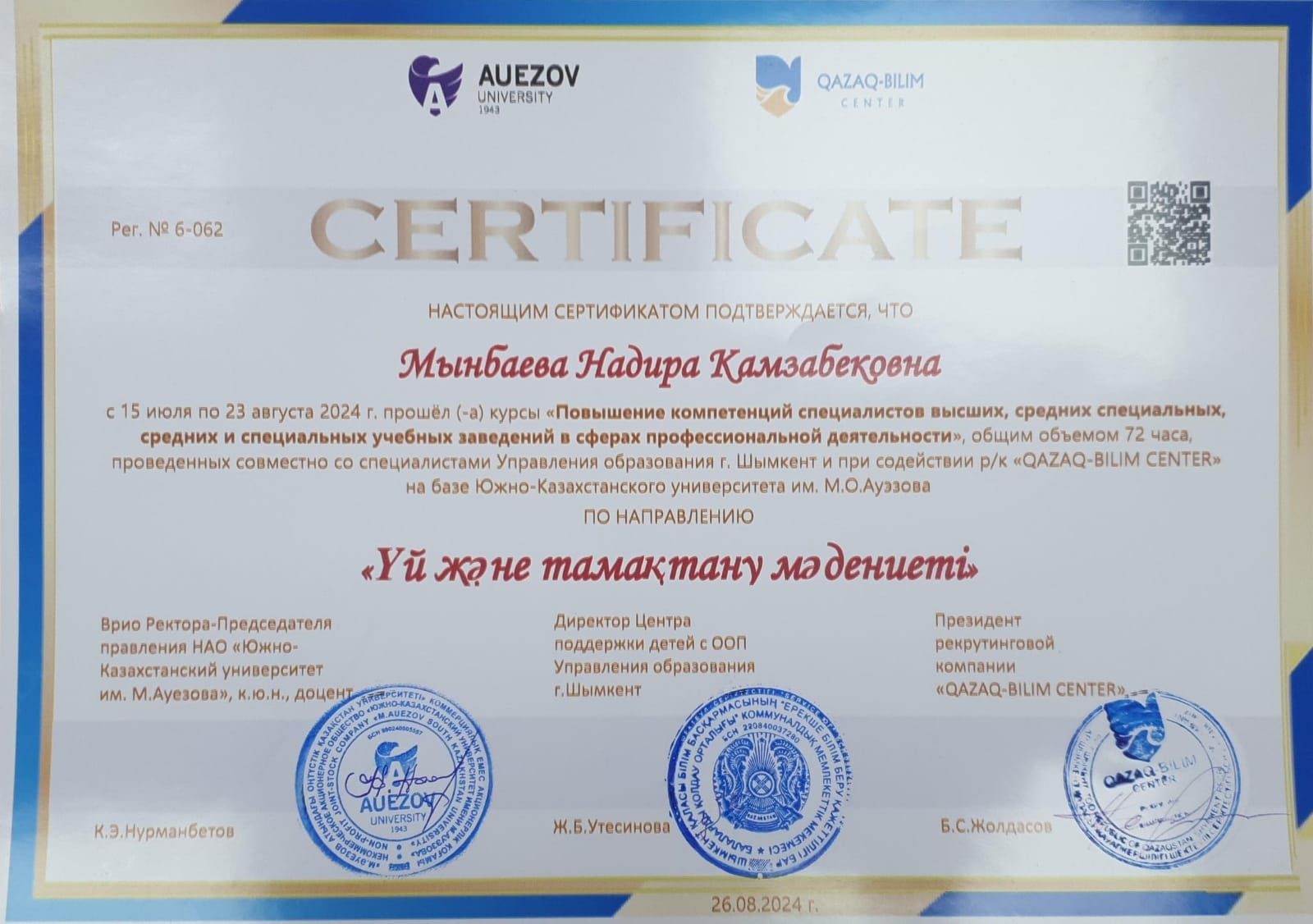 Мынбаева Надира Камзабековна «Үй және тамақтану мәденитті» Сертификат берілді.