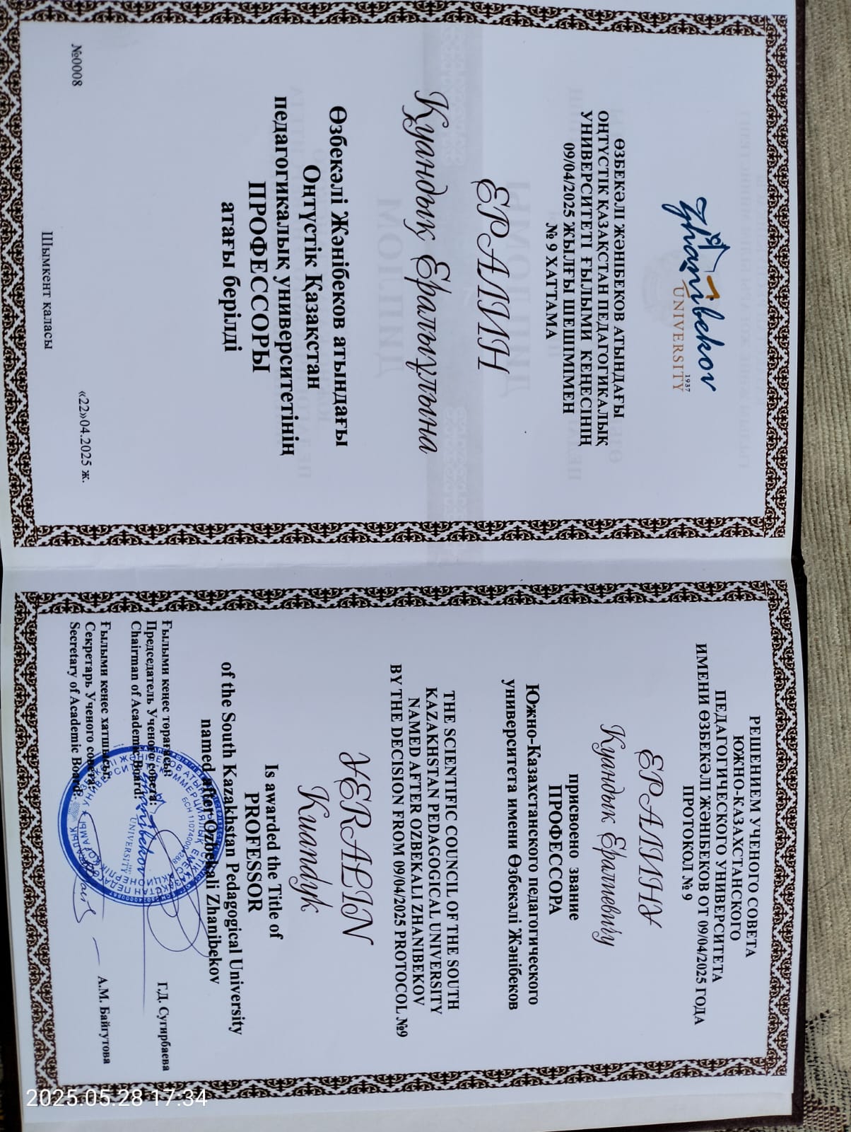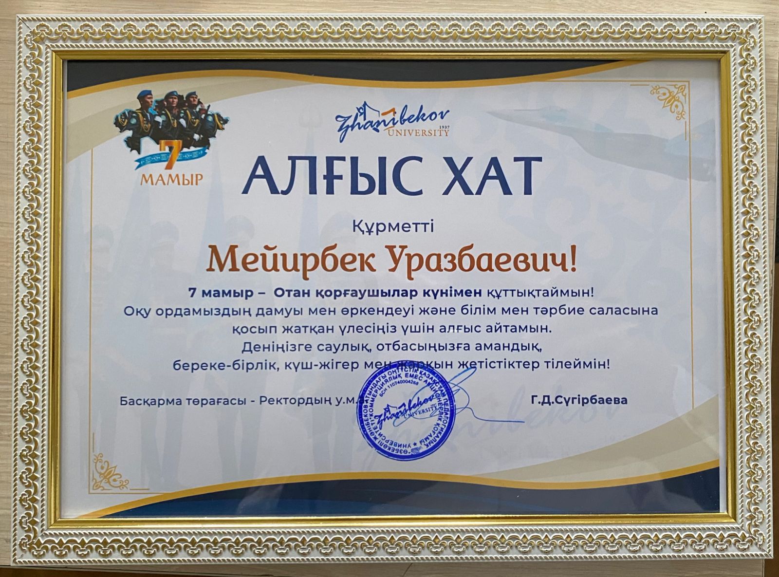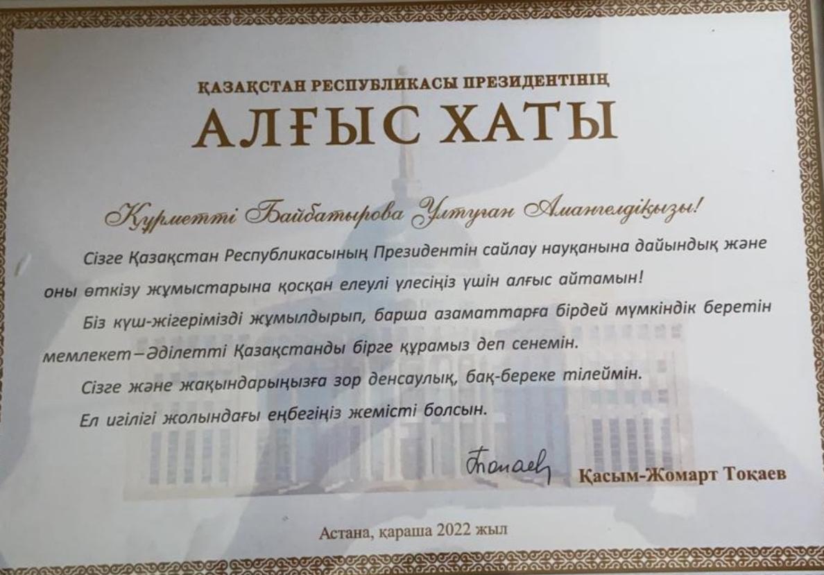ҚР президентінің алғыс хаты. У.Байбатырова