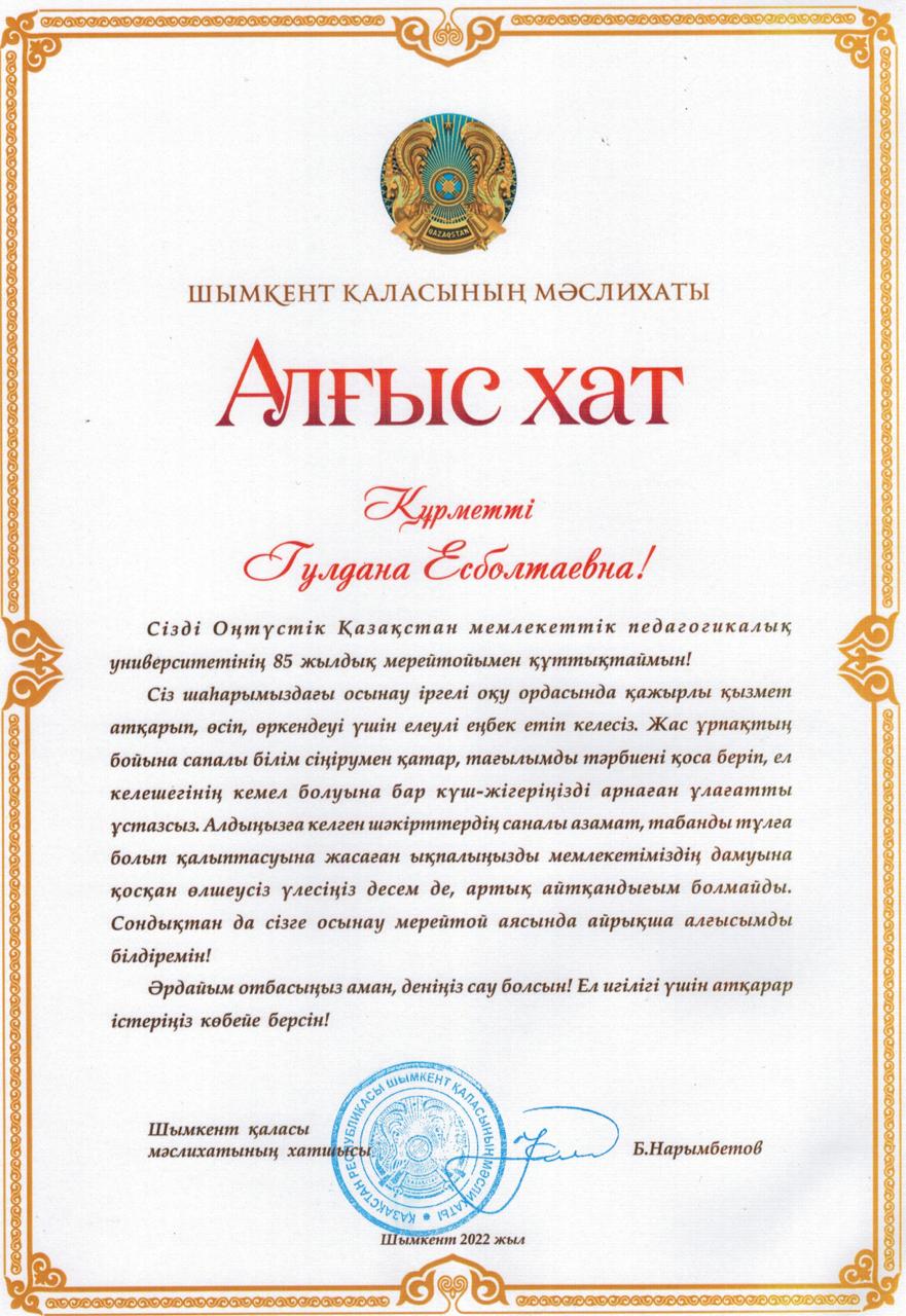 Алғыс хат. Пернебекова Г.Е.