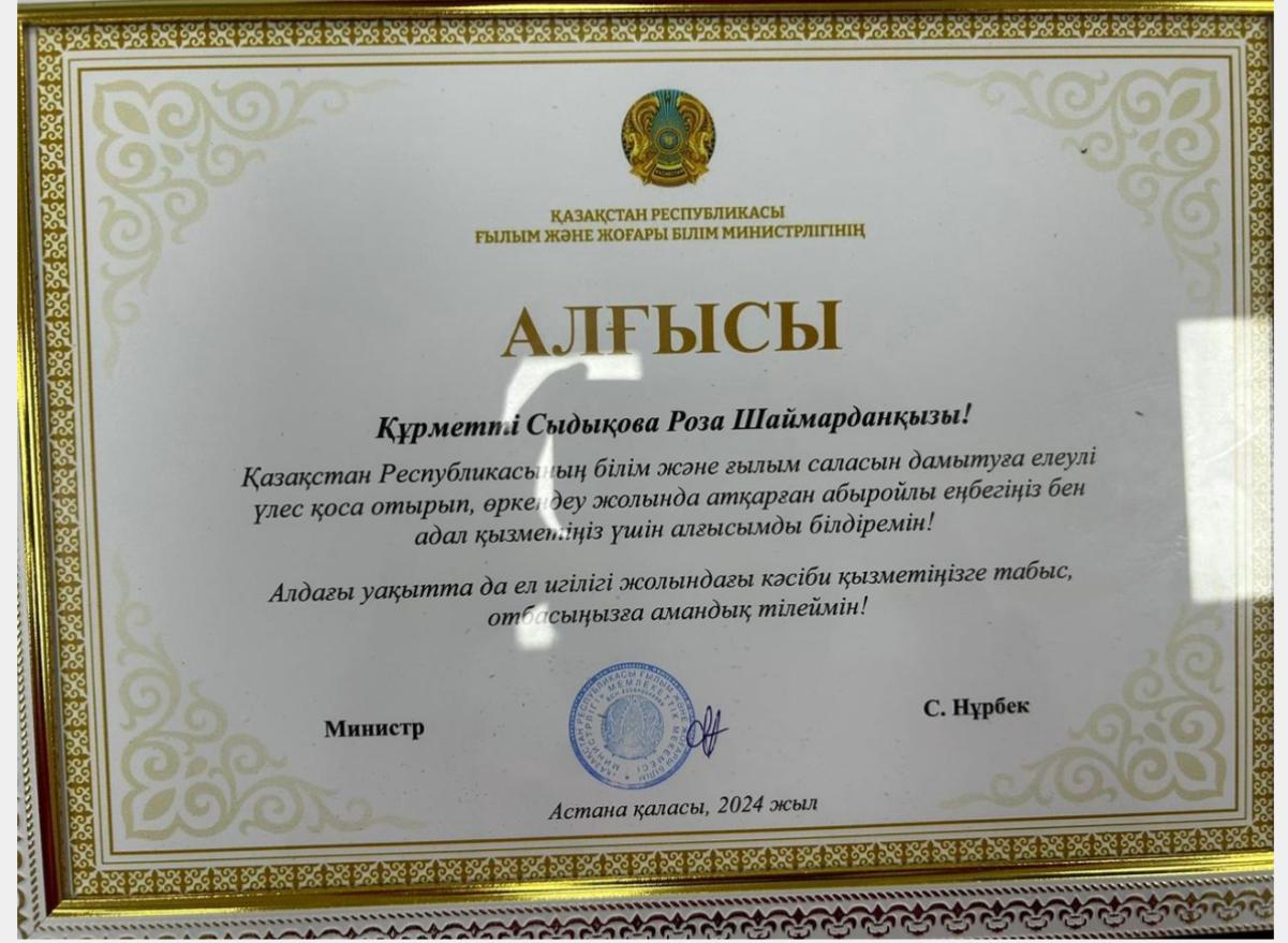 Алғыс хат. Сыдыкова Р.Ш.