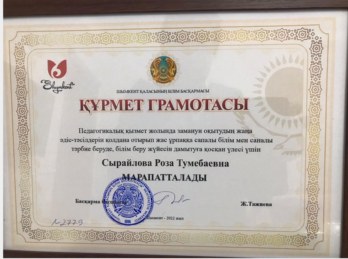 Құрмет грамотасы. Сыраилова Р.Т.