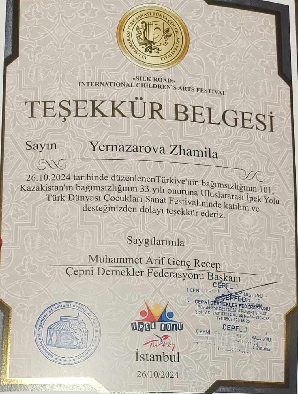 Сертификат Ұлттық өнерді ұлықтаған "Жібек жолы айшықтар" ұлттық киім дизайнерлерінің көрме-байқауына қатысқаны үшін Мыңбаева Н
